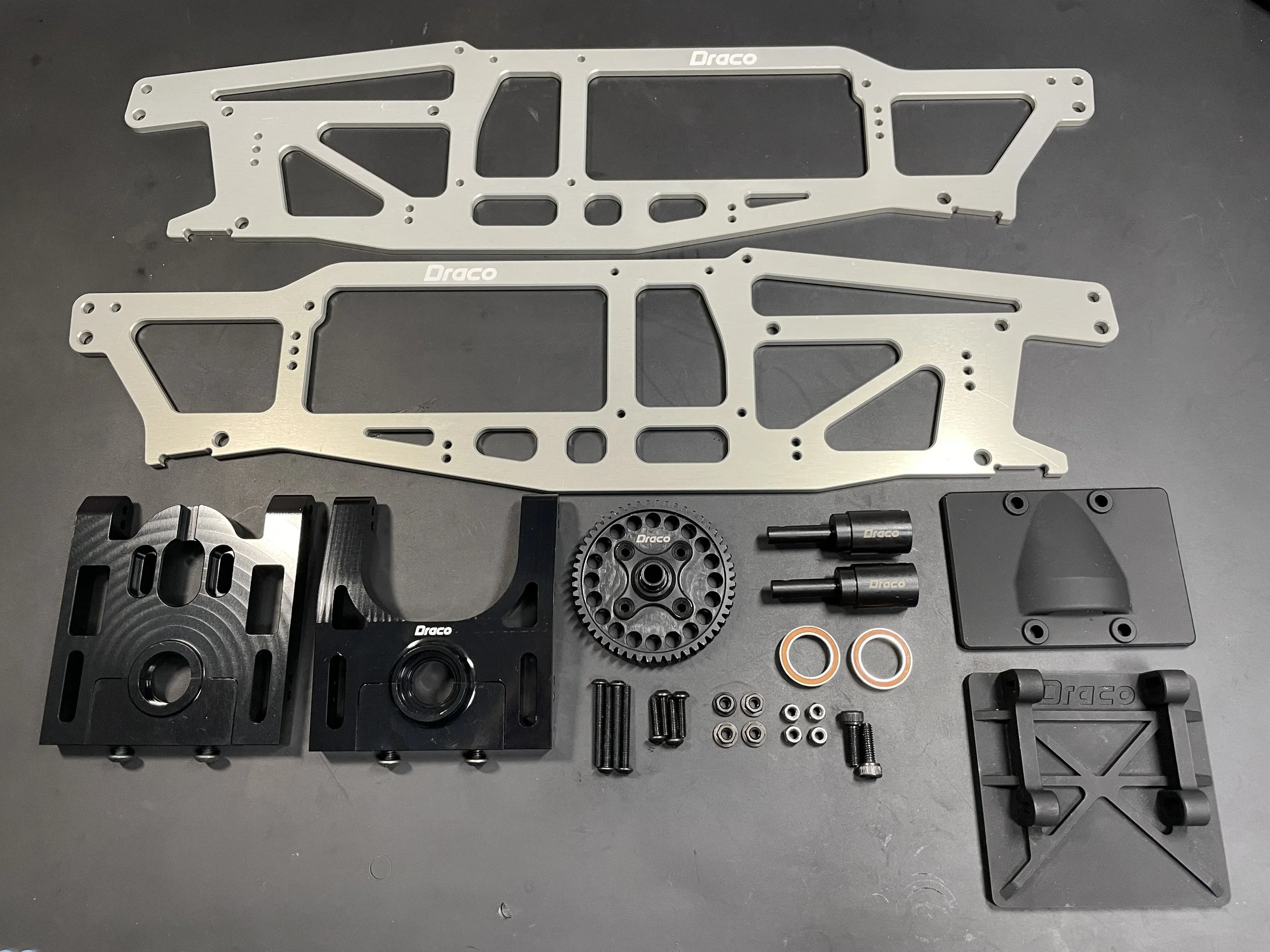 The Draco ECK replaces the centre Savage X section with the Draco Centre Diff Set and Draco TVPs. You can also add the battery boxes and/or Rear ESC Mount depending on your needs.